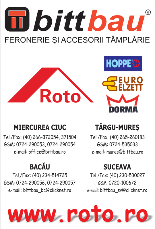 Compania Bitt-Bau - Miercurea Ciuc promoveaza sisteme de feronerie si accesorii destinate productiei de tamplarie termoizolanta, fiind unul dintre principalii distribuitori ai societatii Roto Romania, la nivel national. Totodata, firma a stabilit relatii de parteneriat, in vederea comercializarii de produse Hoppe - Germania, Euro-Elzett - Ungaria, Dorma - Austria etc. "Pentru a veni in sprijinul partenerilor de afaceri, dispunem de centre logistice situate in localitatile Miercurea Ciuc, Targu Mures, Bacau si Suceava, din cadrul carora se efectueaza livrari in maximum 24 de ore, atat pentru clientii din zonele limitrofe, cat si catre beneficiarii din toata tara. Avantajele colaborarii cu societatea Bitt-Bau constau, in principal, in asigurarea stabilitatii afacerilor cu tamplarie termoizolanta, aspect fundamental mai ales in contextul economic actual", mentioneaza reprezentantii companiei. Pentru mai multe informatii, click aici!