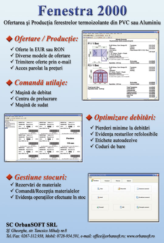 Societatea OrbanSOFT, din Sfantu Gheorghe (judetul Covasna), promoveaza noua versiune a software-ului Fenestra 2000, care a fost actualizat cu programe inovatoare (destinate ofertarii pentru calculatoare PDA, urmaririi comenzilor/platilor etc.), in acelasi timp fiind disponibile foarte multe imbunatatiri cu privire la modul de lucru si la editare. "Astfel, dupa instalarea Fenestra 2000, firmele ce activeaza pe piata autohtona de tamplarie au la dispozitie un instrument de lucru complet si complex in vederea optimizarii si gestiunii adecvate a activitatilor de ofertare si productie a ferestrelor termoizolante din PVC sau aluminiu. Conceput ca o aplicatie modulara, Fenestra 2000 permite efectuarea unor operatii complexe, structurate in functie de fiecare palier al activitatii, astfel: ofertare si productie - elaborarea de oferte exprimate in euro sau in moneda nationala, posibilitatea alegerii diverselor modele de ofertare, transmiterea ofertelor prin e-mail (exista inclusiv optiunea tiparirii acestora prin intermediul imprimantei), protejarea accesului la preturi (cu ajutorul unei parole); comanda/coordonarea utilajelor - program compatibil cu liniile tehnologice tip CNC folosite pentru debitare, sudare si prelucrare; optimizarea debitarii - minimizarea pierderilor rezultate ca urmare a taierii reperelor, evidenta materialelor refolosibile, tiparirea de etichete autoadezive, generarea codurilor de bare; gestiunea stocului - rezervari de materiale, comanda/receptia materiilor prime, componentelor si accesoriilor, evidenta operatiunilor efectuate in stoc etc. Practic, toate modificarile care se aduc sau se intentioneaza a fi aplicate produsului de baza din oferta OrbanSOFT se realizeaza ca urmare a observatiilor/solicitarilor venite de la utilizatori, astfel incat software-ul se adapteaza permanent celor mai exigente cerinte ale pietei", precizeaza reprezentantii firmei. Pentru informatii suplimentare, click aici!